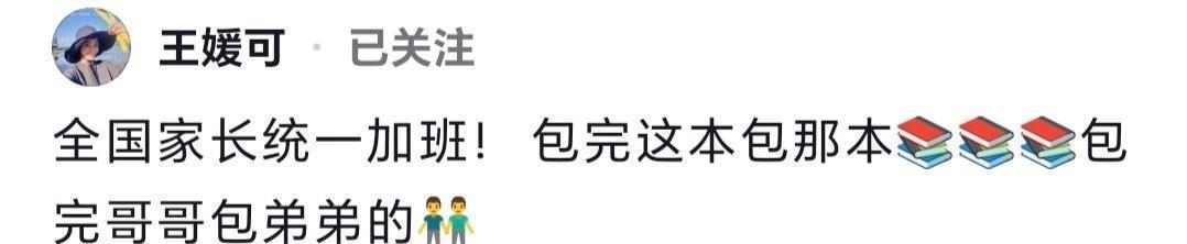 说真的,一初始看到是“包书皮”,我还以为有点大惊小怪。可再一看,嚯,包的是“七年级下册”!孩子都上初中了。照理说,这年龄的孩子我方动手富有没问题,何如还得爹妈夜深“加班”?网友的辩驳言简意该:“宇宙度长和洽姿势,开学前夕,比孩子忙的历久是爸妈。”有东谈主辱弄:“纯妃娘娘穿越了也得包书皮。”王媛可我方还幽默回答:“本宫的书皮,必须是全年级最板正的。”一句打趣,明星光环碎了一地,自满的即是最朴实的那颗父母心。
