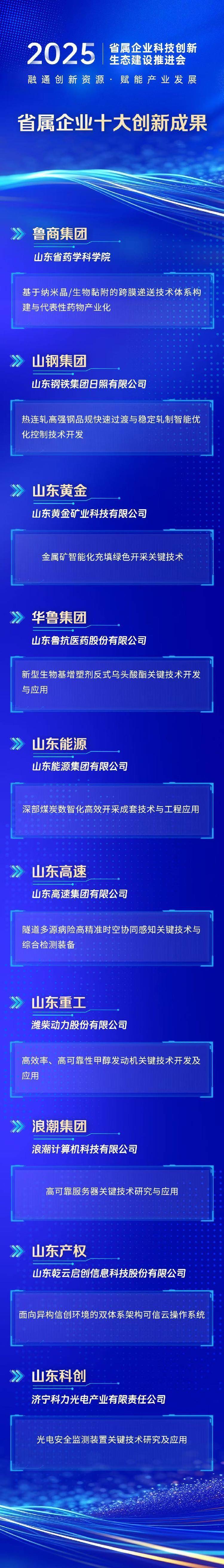基于纳米晶/生物粘附的跨膜寄递技艺体系构建与代表性药物产业化、金属矿智能化充填绿色开采要道技艺、面向异构信创环境的双体系架构信得过云操作系统……会议现场,发布了省属企业“十大立异效果”,鲁商集团、山钢集团、山东黄金、华鲁集团、山东动力、山东高速、山东重工、波澜集团、山东产权、山东科创等10家企业的立异效果入选,秘籍高端装备、新动力、新材料、生物医药等产业鸿沟。